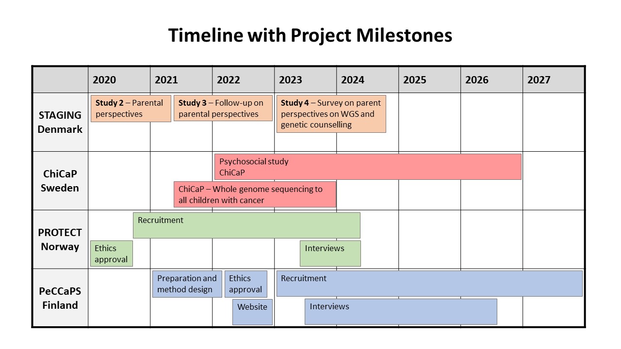 The PROTECT germline study completed inclusion in February 2022, and we are at the moment analyzing data and preparing articles for release. We plan to expand the part of the PROTECT project addressing ethical and psychological aspects with the Psycho-Social and Clinical Communication aspects of childhood cancer predisposition testing (PROTECT-PSCC). Here we will seek to generate called for knowledge about the psychosocial impact of CPS testing, the information and support needs of the involved families and health care personnel, and to develop new tools for communication and implementing them in clinical practice to better meet the needs of health care personnel and families.